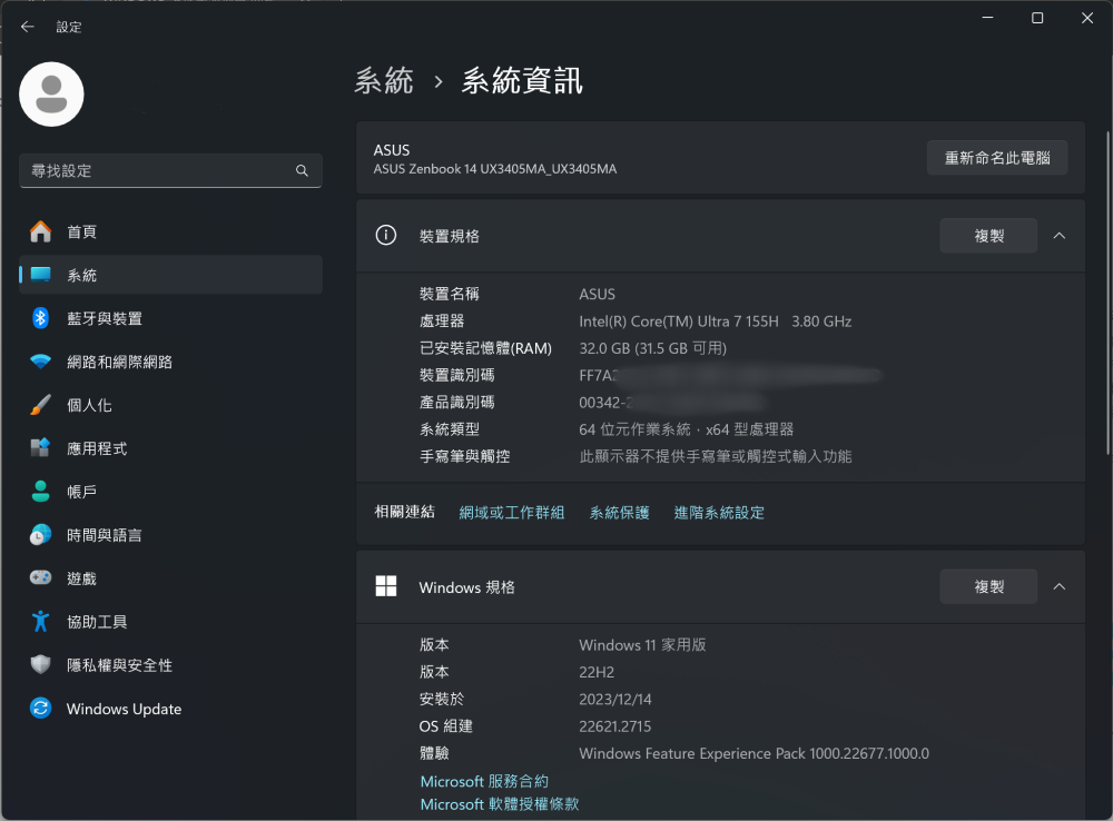系統資訊上標明使用 Intel® Core™ Ultra 7 155H 3.8GHz 處理器,搭配 32GB RAM。