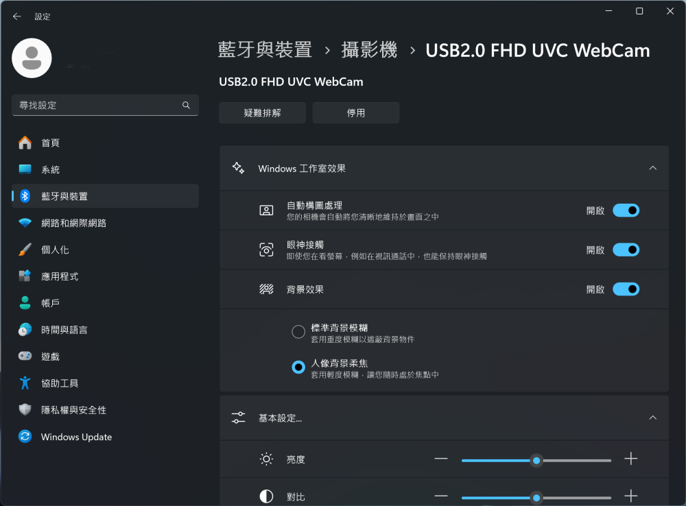 從設定裡的藍牙與裝置找到攝影機選項,就可以調整 Windows 工作室效果(Windows Studio Effect)透過內建的 NPU 自動構圖、調整眼神接觸以及模糊背景。