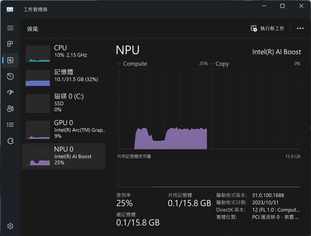 啟用時可以看到 NPU 正在辛勤的運算著。