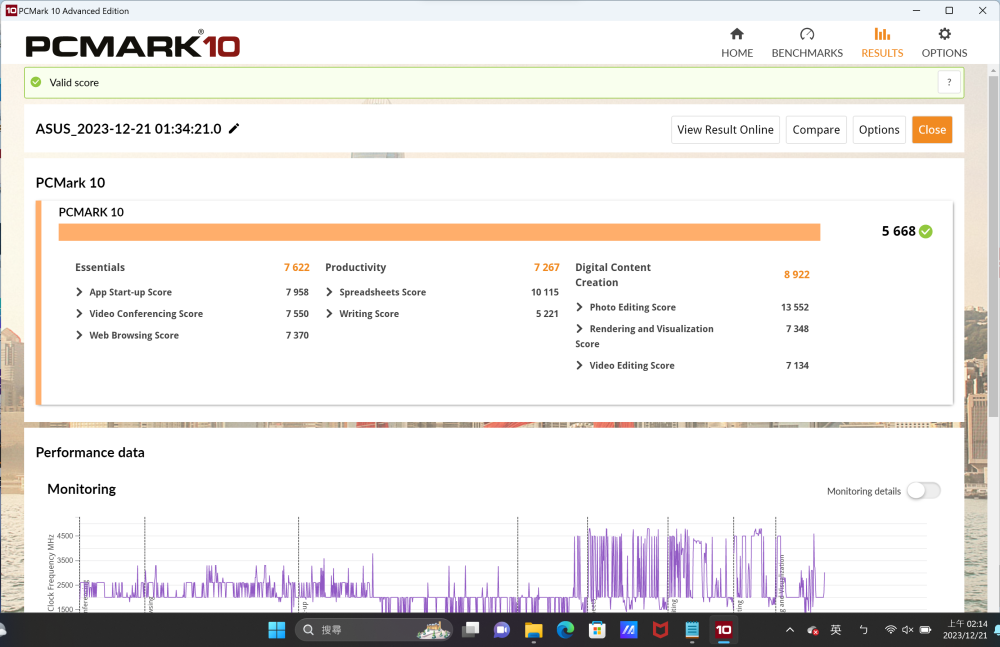 PCMark 10 跑分測試得到 5668 分,以輕薄筆電來說表現還滿不錯的。