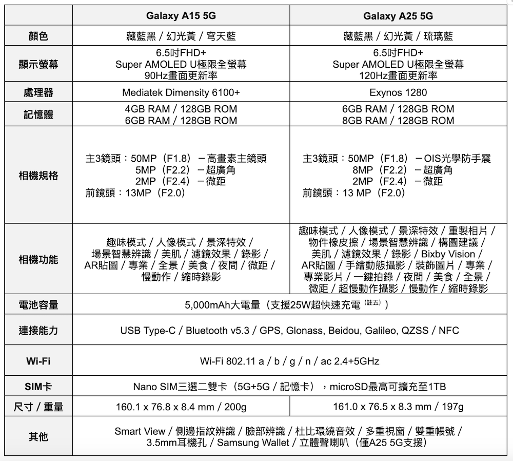 [Galaxy A15 與 A25 5G 規格表]