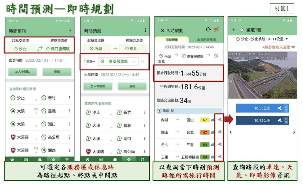 高公局也特地於 1968 App 提供「旅行時間預測」服務,內含「即時規劃」、「未來時間預測」及「旅行時間訂閱」等三大功能,功能概要如下: