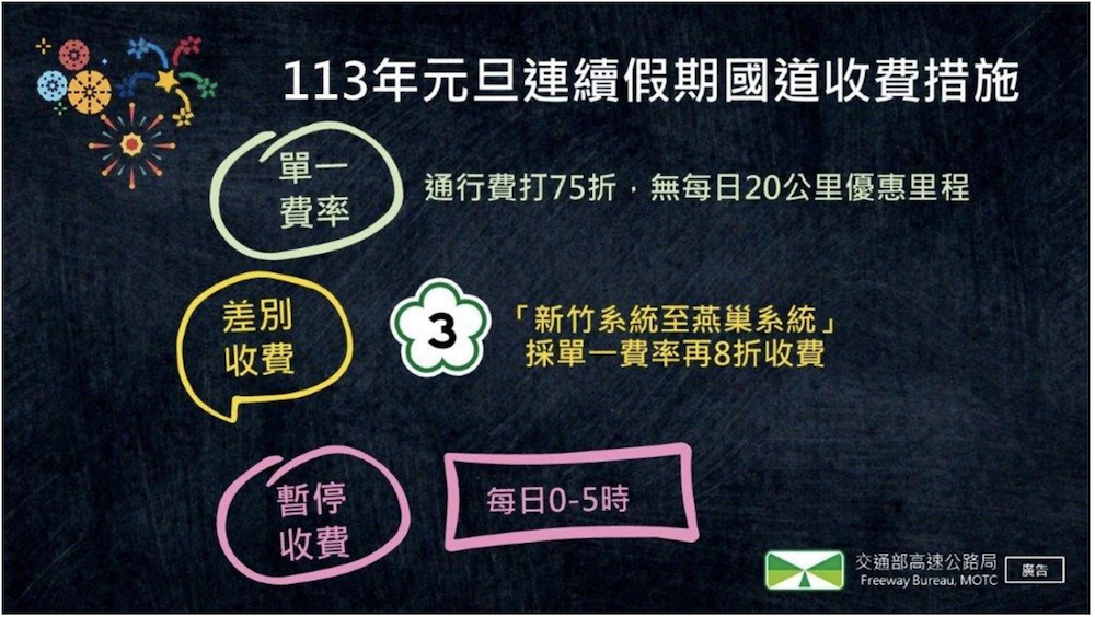 (二) 路段差別費率:112 年 12 月 30 日至 113 年 1 月 1 日,國 3「新竹系統至燕巢系統」採單一費率再 8 折收費。
