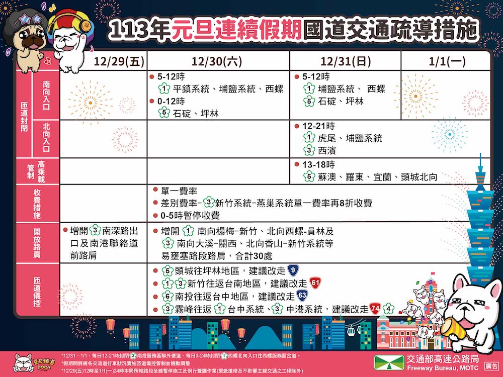 三、112 年 12 月 31 日至 113 年 1 月 1 日,每日 12 至 21 時,封閉國 1 埔鹽系統、虎尾及國 3 西濱北向入口。