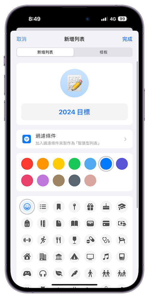 步驟 2、在列表中輸入這個提醒事項的名稱,像是「2024 目標」、「健康生活」、「學習計畫」…等,還能從下方的顏色與符號來為這個提醒事項加入更有辨識度的標記。