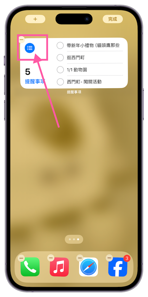 所以我們在桌面上空白處長按,就能選擇左上角的「+」來加入「提醒事項」小工具。這邊有提供三種尺寸能夠選擇,我們可以依照自己喜歡的版面來排版。