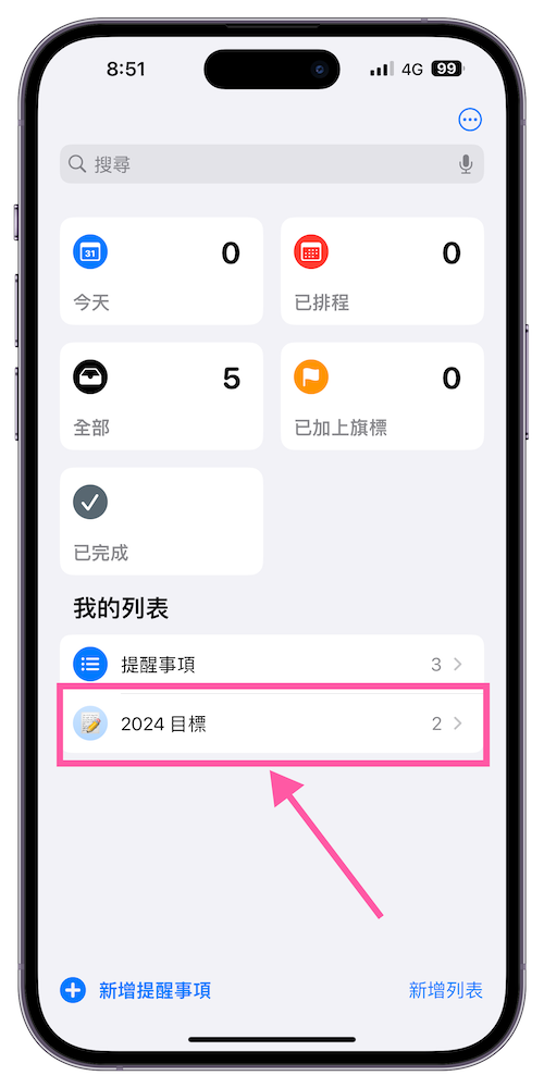 步驟 3、當提醒事項得各目標資料夾分類做好後,就能一一在目標資料夾中加入真正計畫的子項目,像是 2024 年想要出國幾次、存到多少錢; 運動健身上每天要喝多少水、跑步30 分鐘等… 。