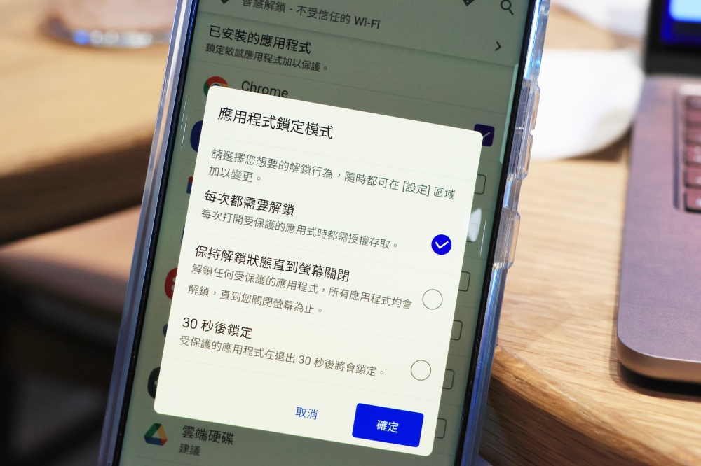 應用程式鎖定的方式很人性化可以選擇,看是要每次使用時都解鎖,或是只在螢幕關閉後上鎖、30 秒後鎖定等,都可以依照自己的習慣調整。