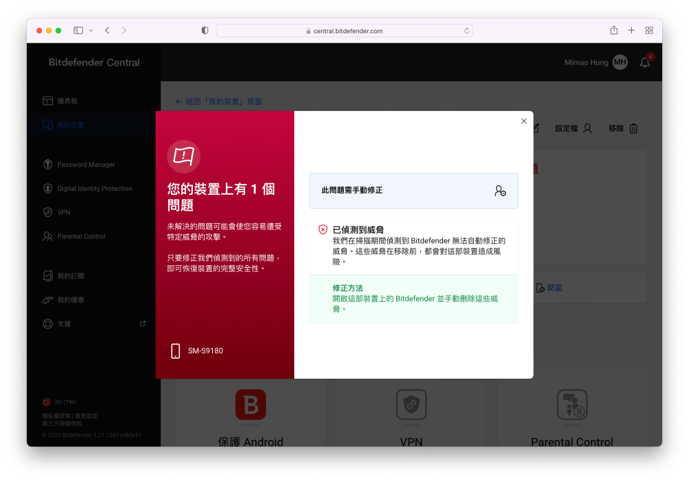 特別是手機,老實說我自認為對資安防護還滿謹慎,但才剛安裝好 Bitdefender 必特防毒,它就發現我手機上有風險,需要手動修正,幸好不是什麼大問題,只是之前安裝的某款應用程式存取太多隱私資料,Bitdefender 必特防毒建議限制其功能或是刪除應用程式。