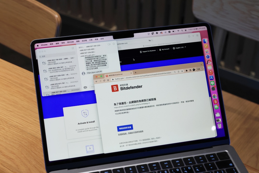 Bitdefender 必特防毒多項資安服務中,我覺得最棒的一項莫過於主動過濾詐騙簡訊了,不論是手機簡訊收到的網址,或是 iPhone、MacOS 裡的訊息收到的網址,Bitdefender 必特防毒都會主動偵測,如果使用者誤點了釣魚網頁,Bitdefender 會主動阻擋,提醒使用者網頁可能會趁機獲取敏感訊息,提醒使用者注意。