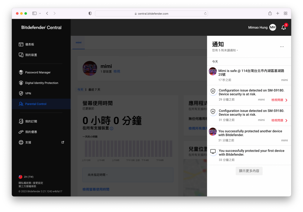 除此之外還有一項很方便的功能,那就是手機定位,比方說年紀大一點的小孩可能可以自己上下課,自己去參加課後活動等,如果爸媽要確認兒童有沒有準時到達學校、準時到家、準時到課後活動的活動地點,都可以透過 Bitdefender 必特防毒的定位查詢。