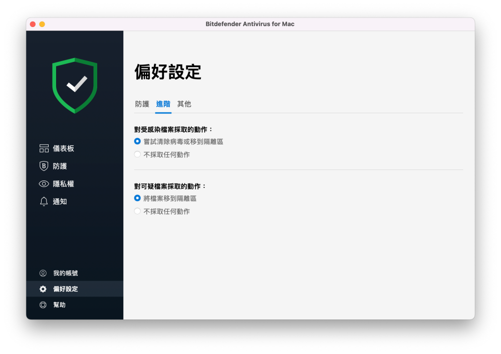 使用者也可以從偏好設定裡面設定,萬一 Bitdefender 必特防毒發現受感染或是可疑的檔案時,應該採取的對應動作。