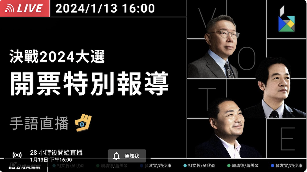 - 公視:《2024台灣大選 開票特別報導》、YouTube(含手語)