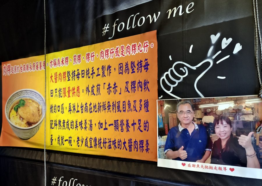 ▼牆上還有肉粿的介紹,肉粿可說是台南在地人才知道的美食,以米漿搭配地瓜粉製成,呈現圓形扁平狀,放入鍋中煎至兩面金黃微穌,淋上特製醬料或羹湯,再加上一顆蛋就是營養又飽足的早餐;我們想吃肉粿好久了,終於找到機會來嘗鮮。