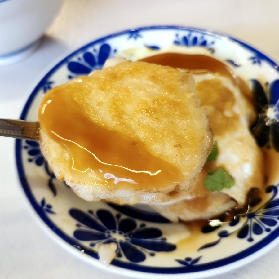 ▼米粿同樣煎至金黃微穌再加入羹湯,吃得到米香之餘,搭配香氣十足的羮湯,鹹甜又開胃!