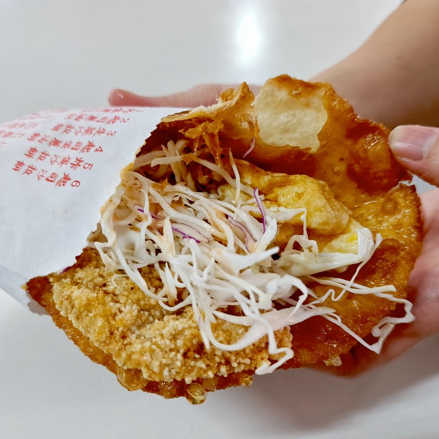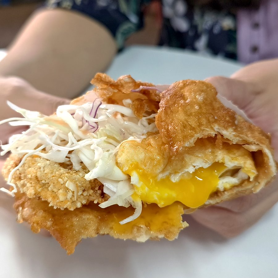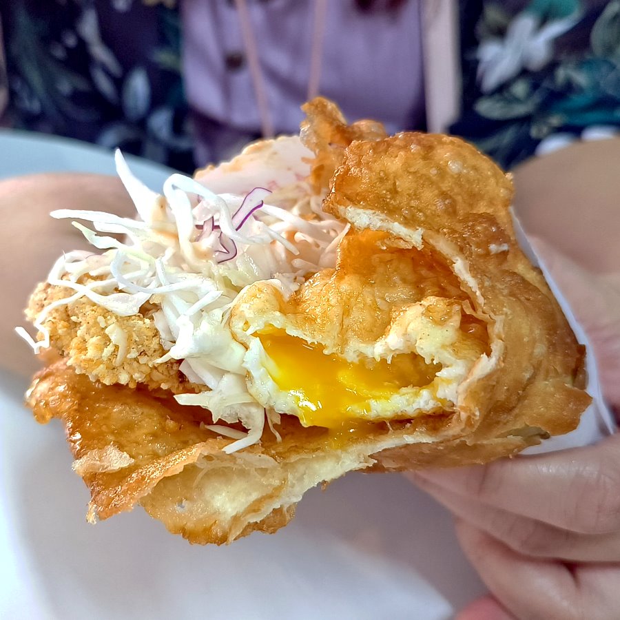▼一口咬下,既能吃到酥脆餅皮,還能吃到外酥內嫩的去骨雞排、爽口的菜絲沙拉及半熟蛋,鹹甜交錯的味蕾既邪惡又不會覺得油膩,好吃耶!
