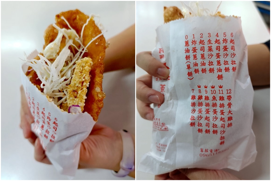 ▼背面也有餐點標示,點多份的話老闆娘會在上頭做記號;雞排、沙拉從蔥油餅中探出頭來,光看就讓人想咬上一口。
