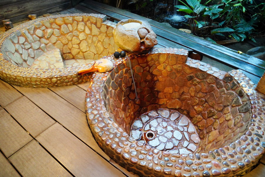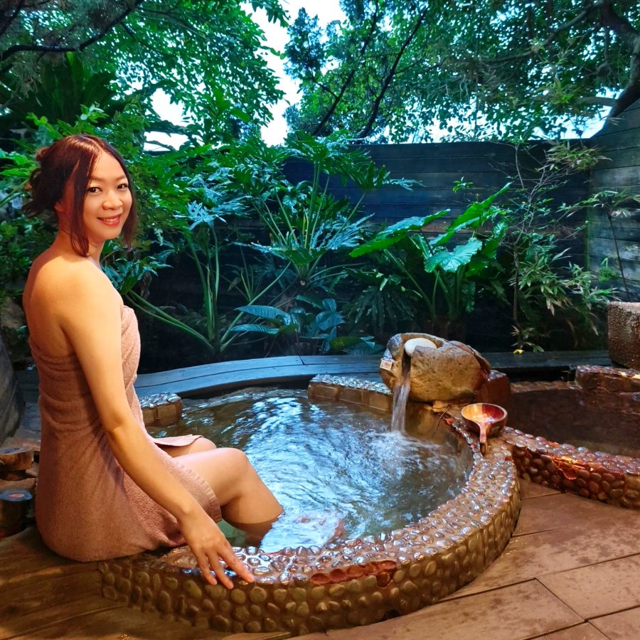 ▼一樓露天風呂,是有黃金湯之稱的海底溫泉,需要穿著泳裝、泳帽才能入場,可以浸泡到全身,泡完通體舒暢,尤其最近這種天氣更加適合。