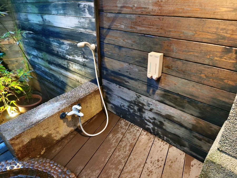 ▼浴池旁邊還有淋浴設備,及簡單的清潔用品,