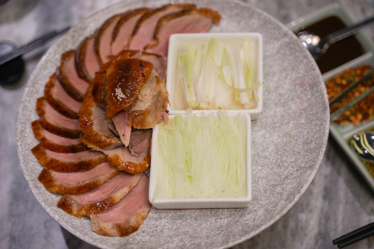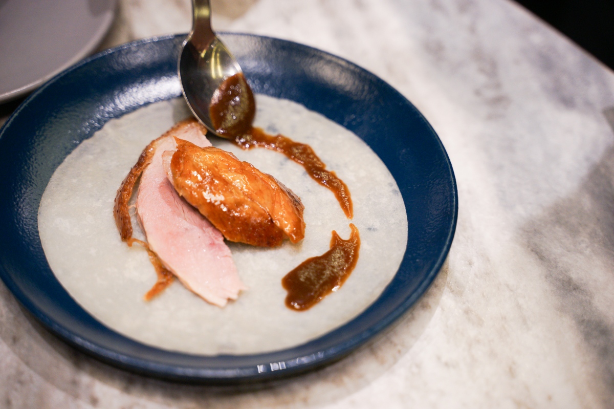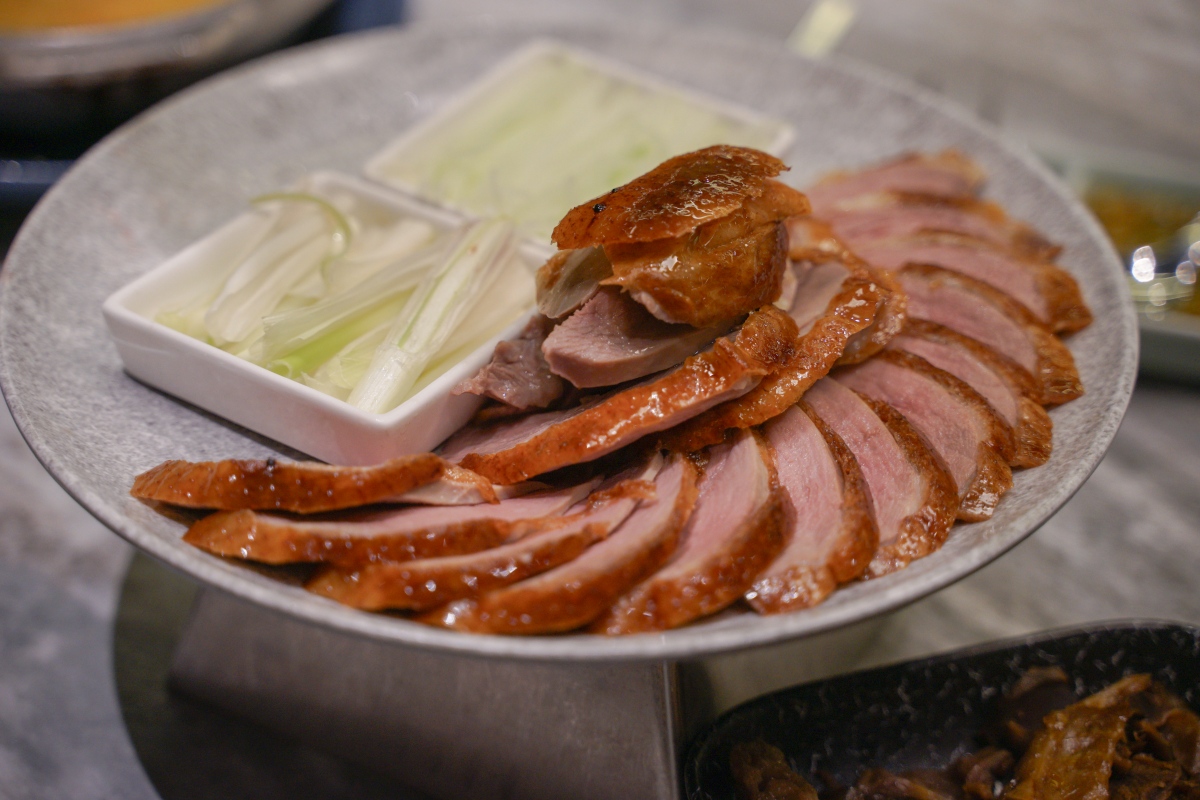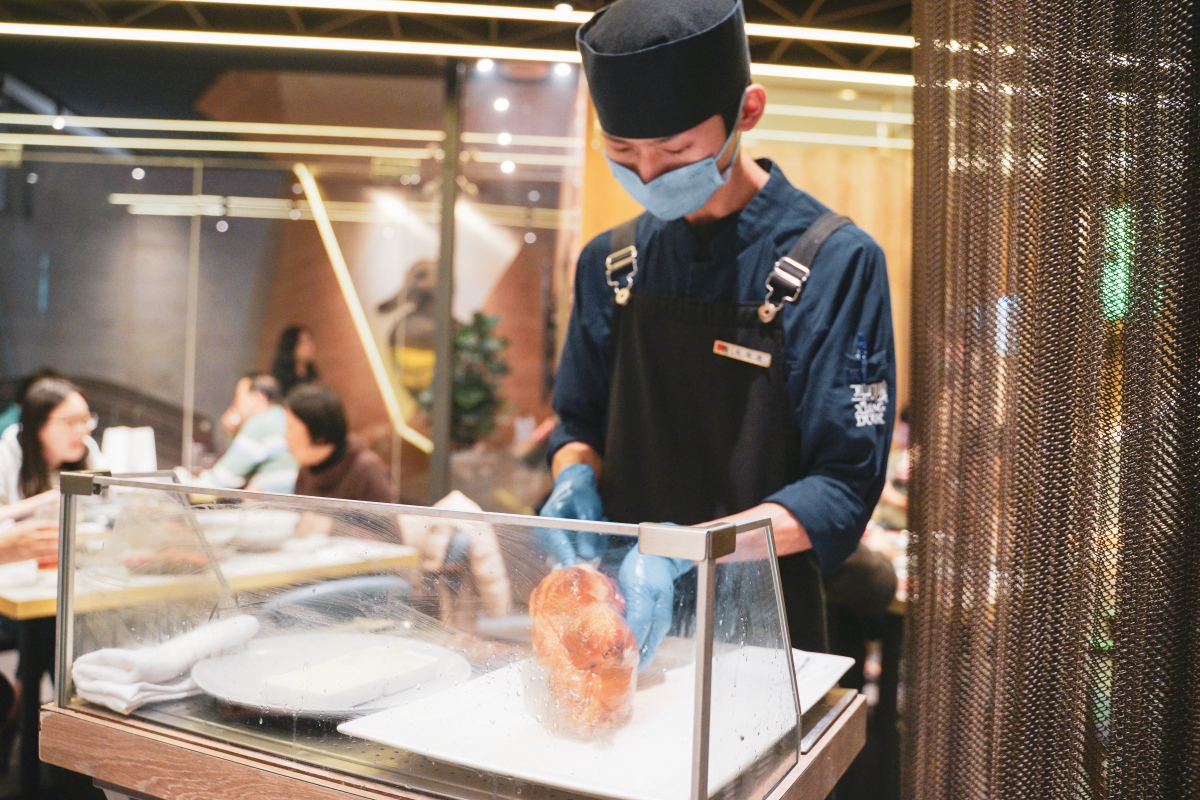 師傅會推車到桌邊服務,現場介紹烤鴨是 2.6 公斤,體型與脂肪比例最完美的櫻桃鴨,使用八種香料並經過 24 小時風乾,酥烤出美味的鴨皮!