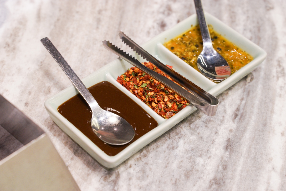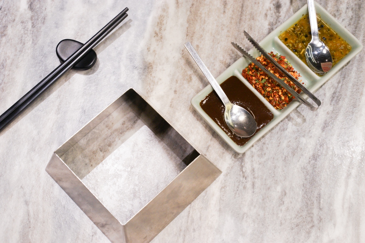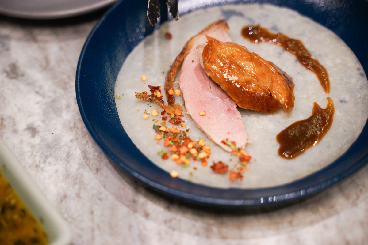 我們這次點的是兩人套餐搭配一些中菜,份量不會太多,還蠻適合和我們一樣的親子小家庭,兩大兩小也很可以!因為有點烤鴨,所以會先送上放烤鴨盤的架子和搭配的醬料。醬料有特製甜麵醬、享鴨花椒鹽、季節蘸水,其中季節蘸水的口味是百香果酸香帶點微辣,可以搭配半月形皮帶肉沾著吃,層次豐富,可以試試看哦!