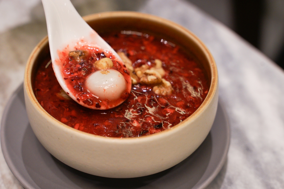 甜點是嫣紅酒釀湯圓和脆糖燉奶,嫣紅酒釀湯圓有滿滿的特製紅麴酒釀,加入核果碎和小芝麻湯圓,溫熱入口,多重的層次感,微甜的風味沒有負擔,也沒有明顯的酒釀發酵味道,舒服的香氣和味道,好吃耶!
