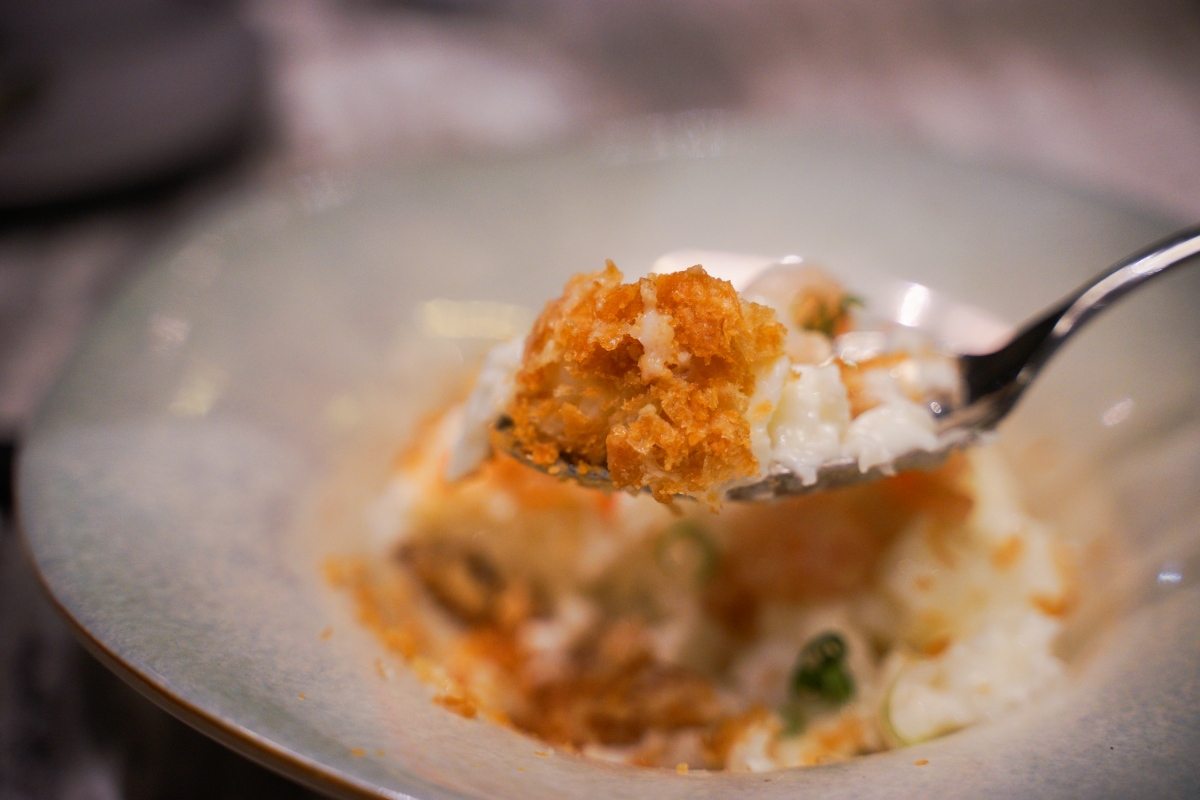 上面白白的是滑嫩的炒蛋白!是不是完全沒想到~上面有著一顆顆鮮甜的蝦仁還有鹹香的珠貝絲,用湯匙挖到底層則是香脆可口的油條!建議大家一口吃進蛋白、蝦仁和底層的油條,有豐富層次的口感和蛋香,我很喜歡!也挖了幾口給阿福吃,因為他很愛吃蛋又愛吃蝦子,他也直呼好吃一直叫爸爸趕快吃(笑)