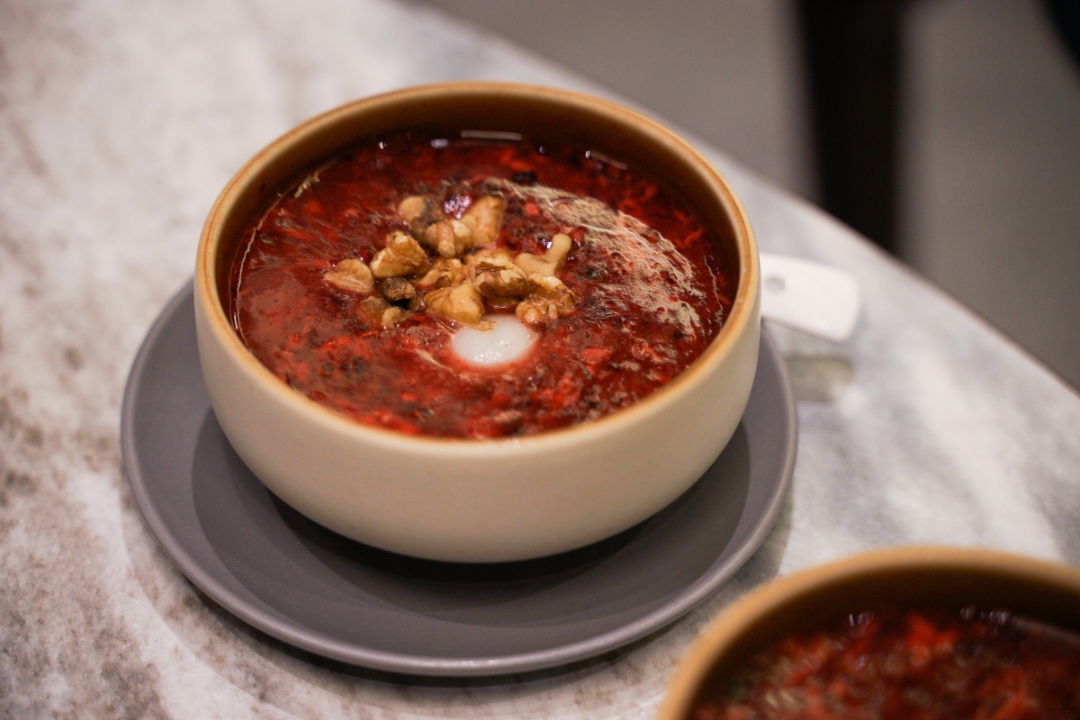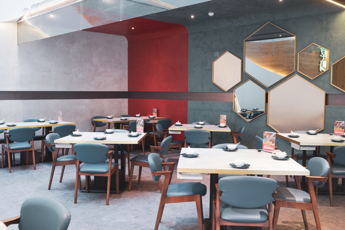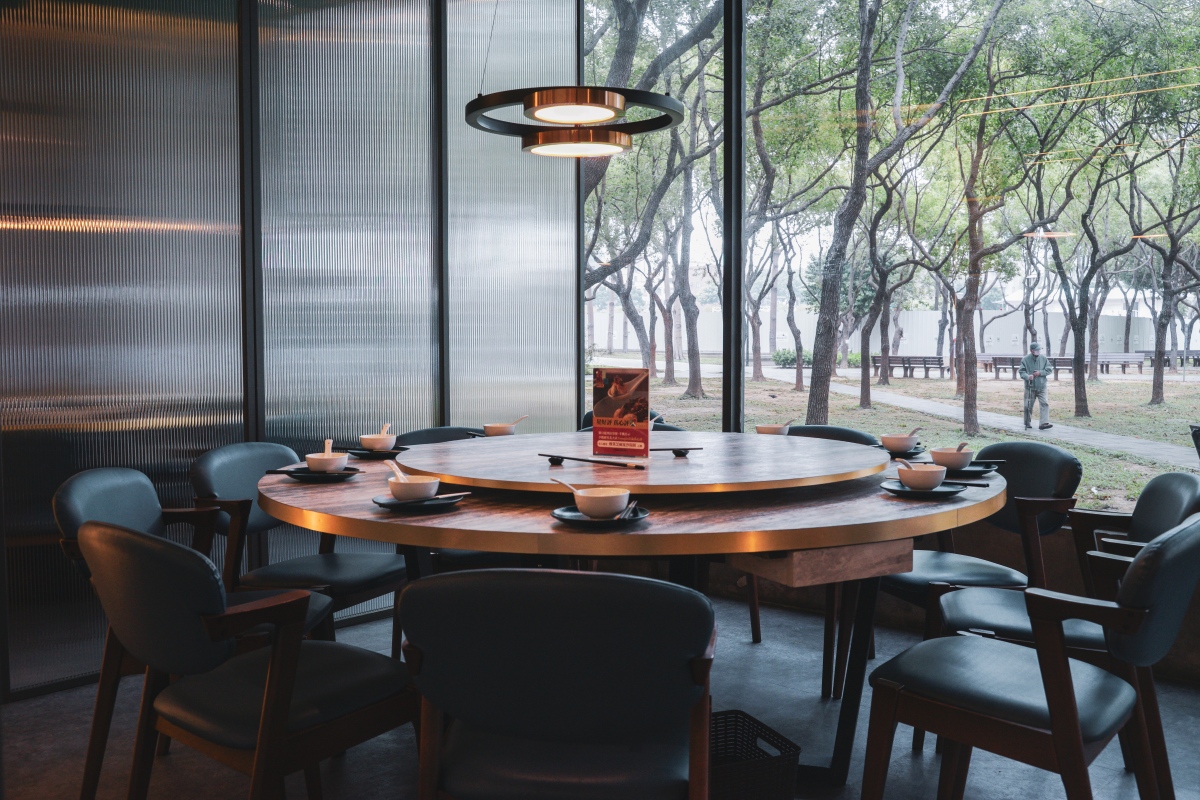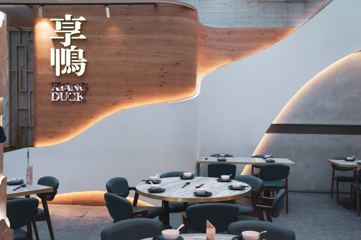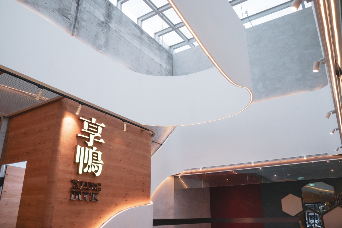 一踏入店內會讓人眼睛為之一亮閃閃發光,挑高空間與天井的設計,使自然光撒入,十分迷人,搭配上方雲朵般的線條以及牆面上看似山巒的大自然抽象藝術設計,讓人不禁想像自己在山嵐月色中品嚐著美味烤鴨,實在是太幸福了!整個空間設計新穎時尚,有別於印象中的烤鴨店,且座位設計符合大眾需求,有開放式座位、類包廂、包廂,不論是兩人還是多人都能好好用餐。