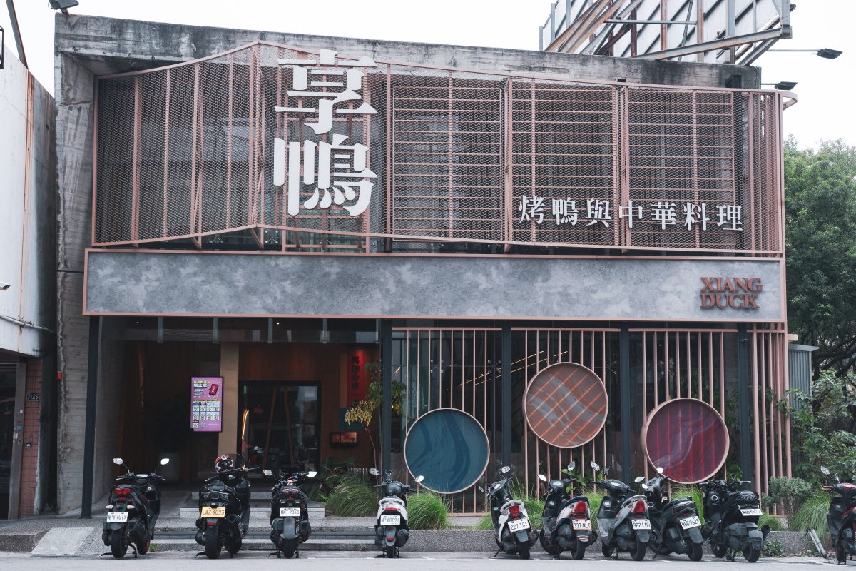 新竹享鴨位於北大路上,停車可以停在斜對面的北大停車場,停車位還蠻多的很方便,機車可直接停放於門口的停車位。相信許多人經過都會多看一眼,偌大的建築,仔細一看別有用心,搜尋了店家的介紹,才瞭解二樓的外觀是利用金屬網凹折成立體仿錐狀構面,象徵脊梁山脈、並且藉由山脈起伏的設計將品牌「享鴨」撐起來!親眼看見覺得非常有立體感,很特別!