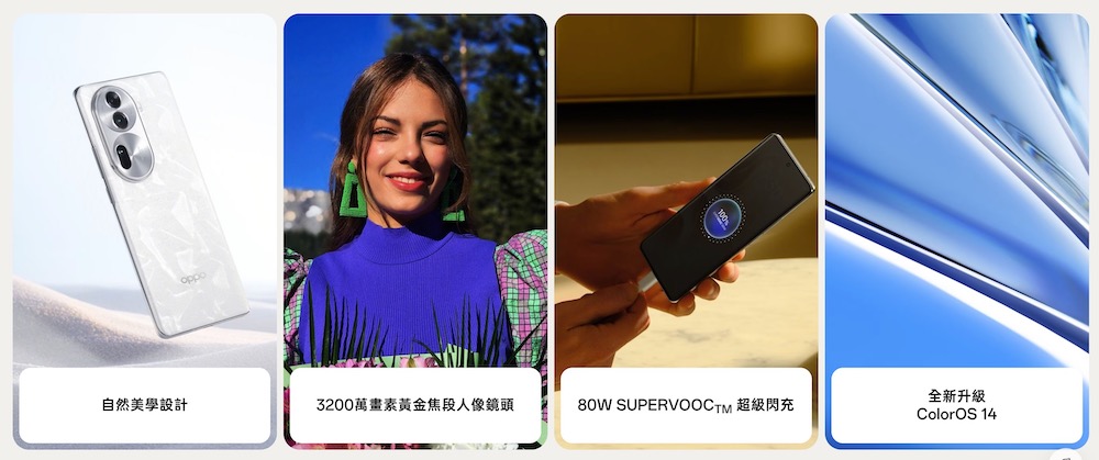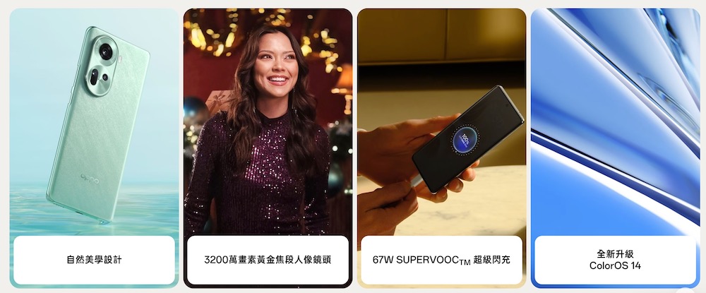 OPPO Reno11 Pro 在台灣網頁上的特色則是「自然美學設計」、「3200萬畫素黃金焦段人像鏡頭」、「80W SUPERVOOC 超級閃充」與「全新 ColorOS 14」。其他規格方面參考中國已發表的版本還有著:6.74 吋 OLED 曲面螢幕、2772×1240 解析度、支援 120Hz 螢幕更新率,搭載高通 Snapdragon 8+ 處理器。