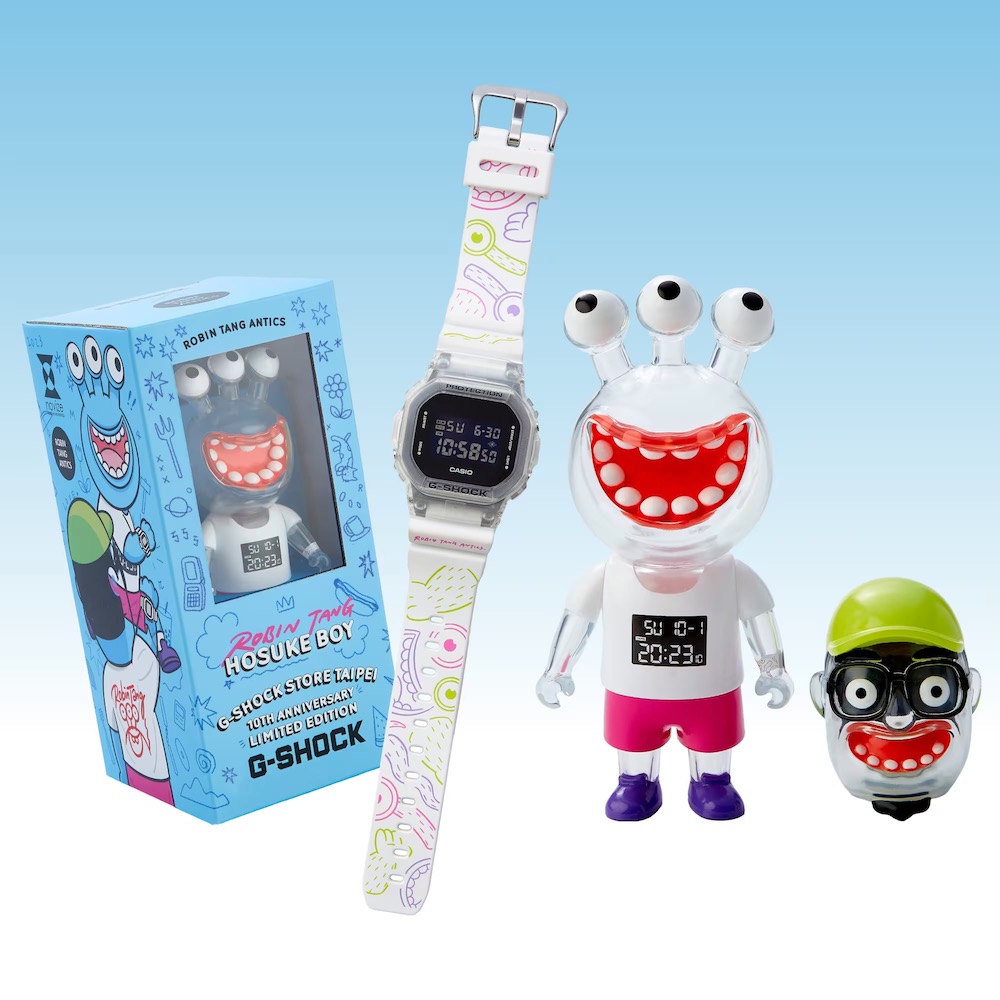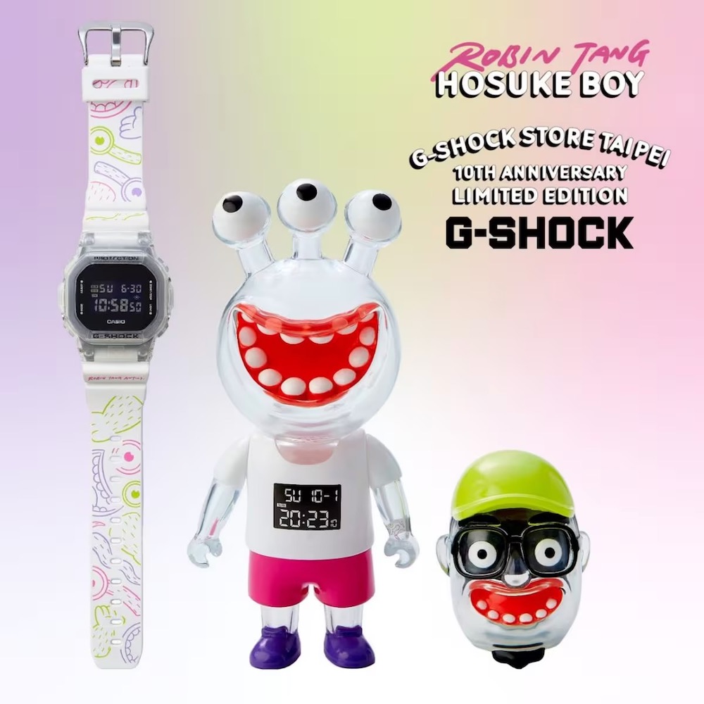 堪稱許多大人們回憶殺的 CASIO 旗下 G-SHOCK 現在為了歡慶 G-SHOCK STORE, TAIPEI 台北東區店在 2023 年末邁入第 10 個年頭,特地攜手台灣在地知名玩具設計師-羅賓唐 (Robin Tang) 一同創作台灣限定聯名腕錶公仔組合,建議售價 NT$5,000。聯名組合靈感源自羅賓唐(Robin Tang)的代表性公仔角色「保介」,採用透明樹脂錶殼的 5600 為基礎型號,並在白色樹脂錶帶上以鮮豔的粉、紫、綠三種夢幻顏色描畫出保介的輪廓,錶殼下方也印製上「Robin Tang Antics」的字樣增添收藏價值,公仔組合以保介男孩為主題,搭配一個身體與兩個頭,讓玩具收藏家可以自己手動組裝享受變換公仔風格的趣味。
