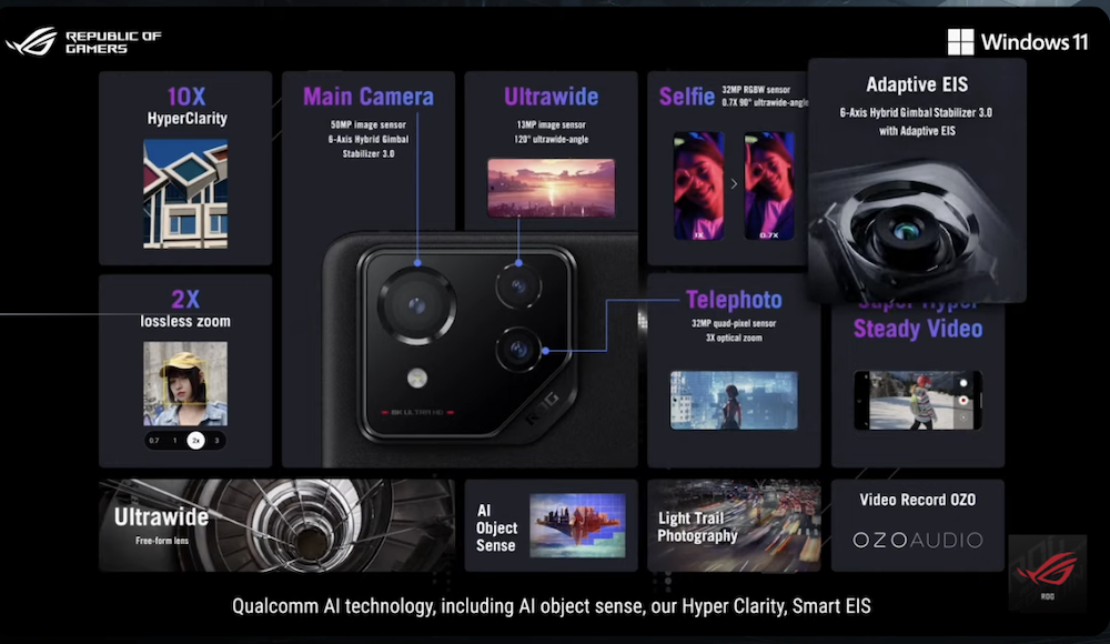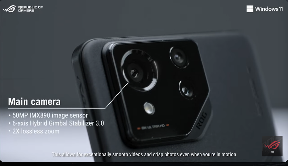 拍照方面 ROG Phone 8 Series 也不馬虎,三鏡頭組合分別為 5,000 萬像素 Sony IMX890 主鏡頭搭載六軸防手震 Hybrid 雲台 3.0,配上 1,300 萬像素超廣角鏡頭採用自由曲面建模光學設計,以及 3,200 萬像素長焦鏡頭具備 3 倍光學變焦和 OIS 防手震功能,前置鏡頭則是 3200 萬像素。