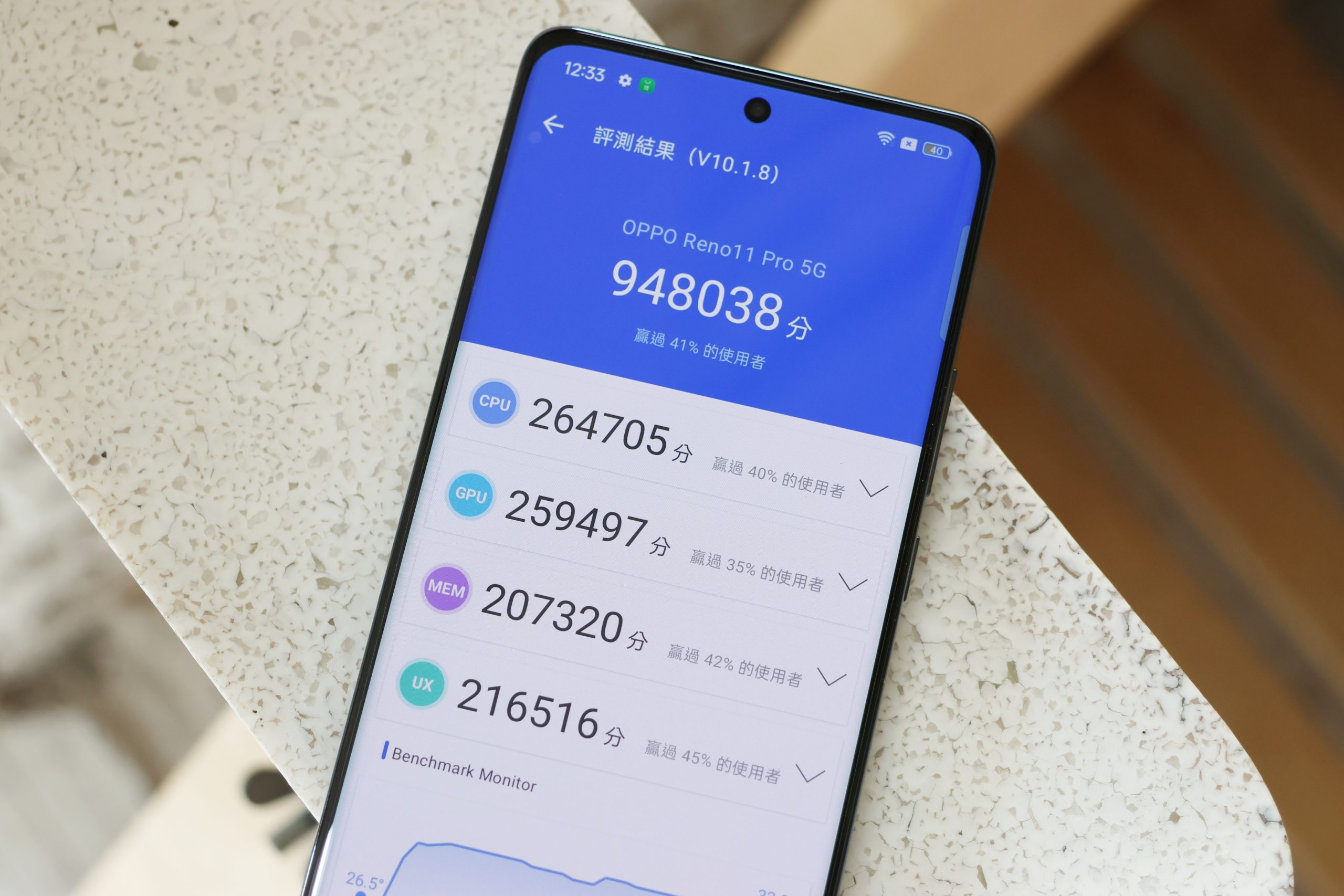 安兔兔跑分得到 948,038 分,跑分時機身溫度不會提高太多,散熱做得還滿不錯的。