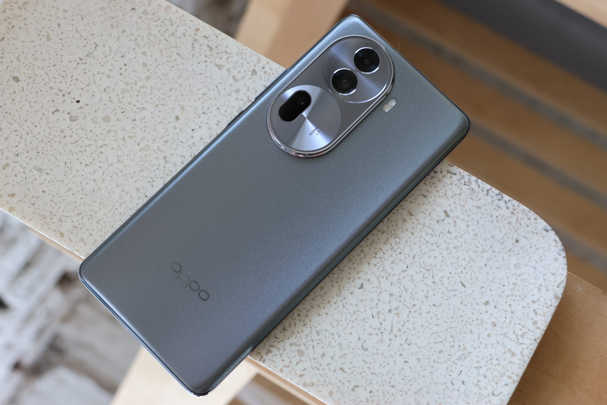這次 Reno11 Pro 機身設計還滿別緻的,機身設計靈感來自大自然中的元素,像是我們拿到的灰色取自岩石的灰,再融入 OPPO Glow 晶鑽工藝,隨著光線照射會透出細緻銀色的反光,頗有夜空星光閃爍的感覺。