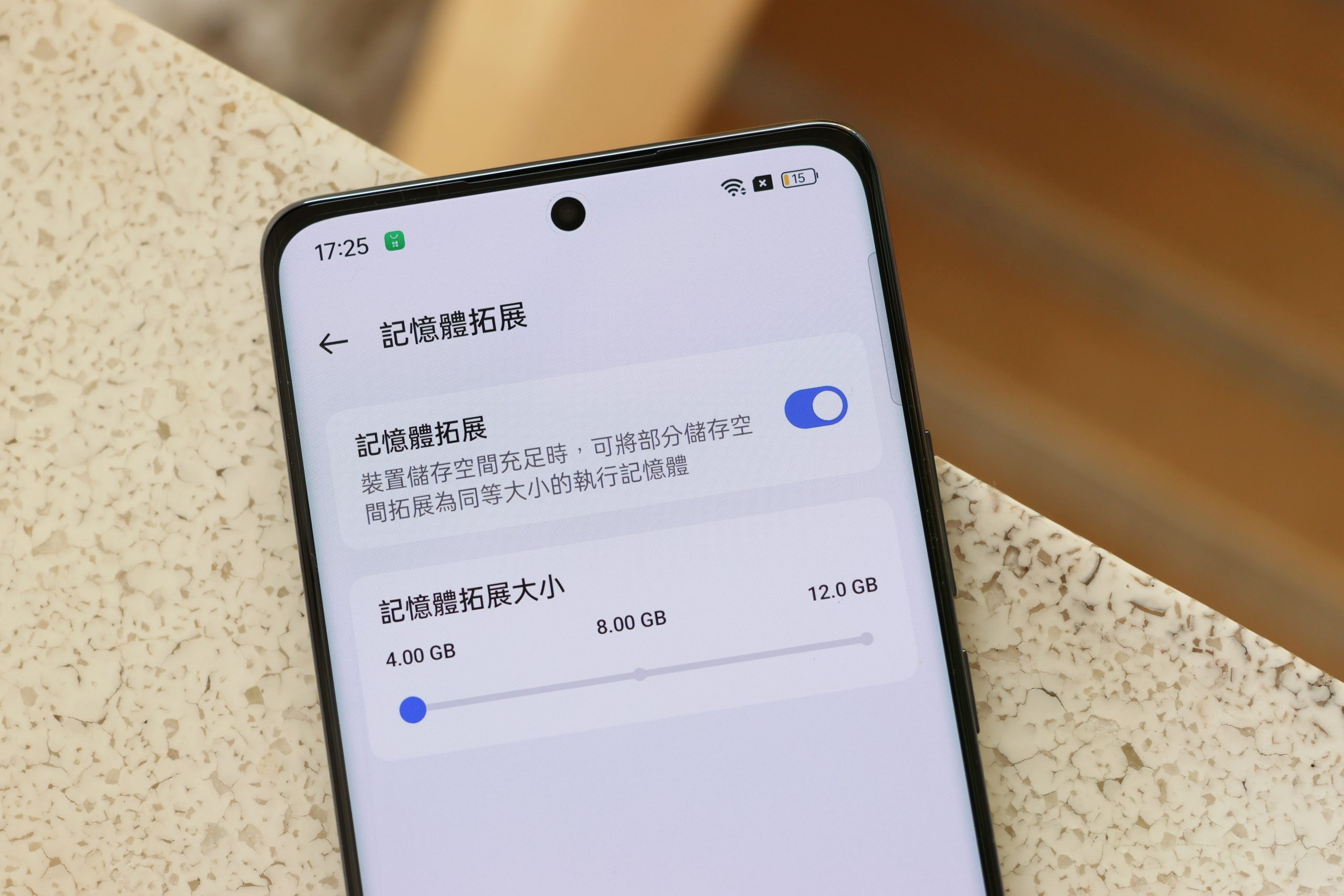 內建 12GB 記憶體,也可從閒置的儲存空間額外調配記憶體來作為虛擬記憶體使用,最高可以加大一倍,讓手機操作起來可以更順暢,記憶體拓展大小則有 4GB、8GB、12GB 可以選,記得選擇完之後要重新開機才能套用。