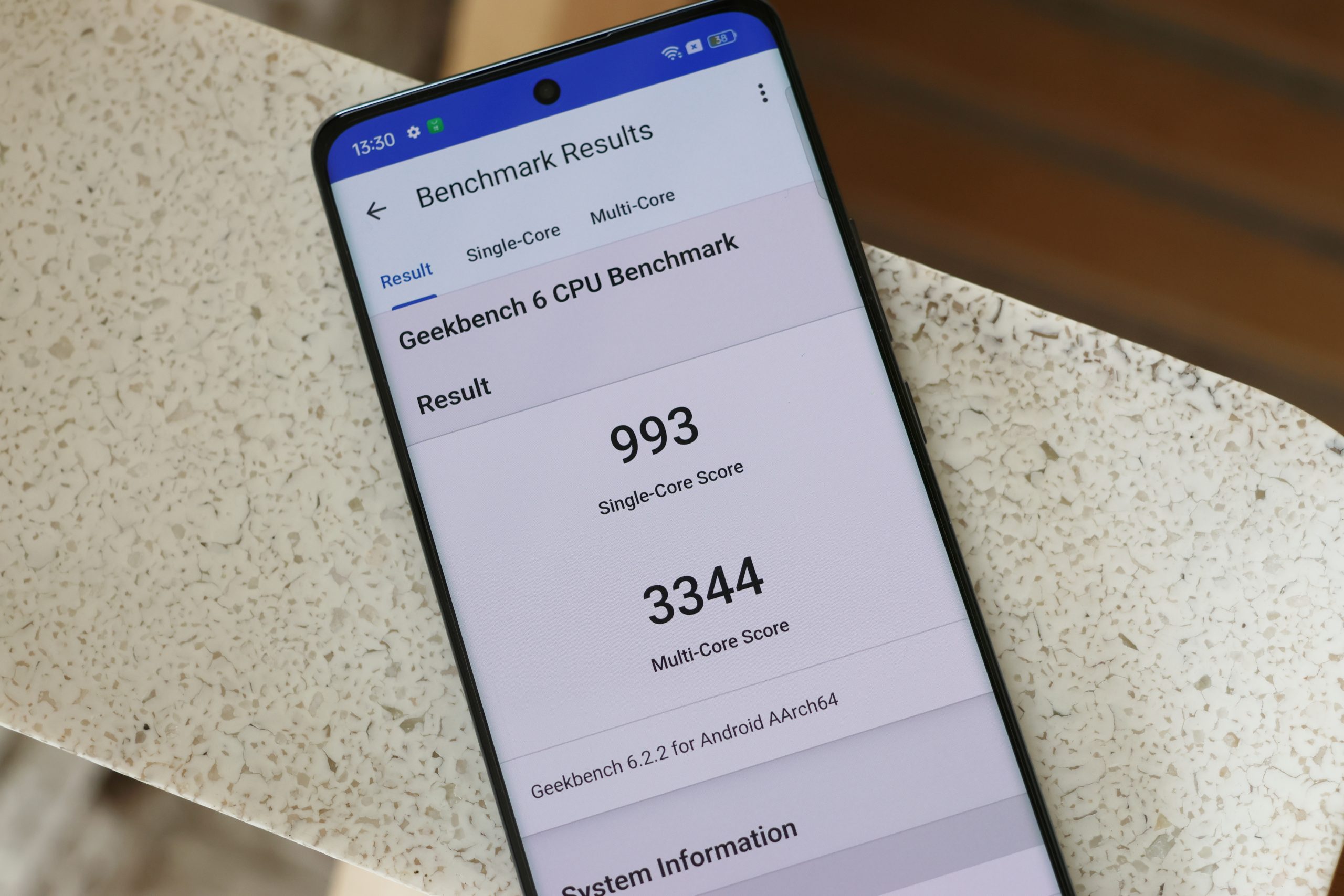 Geekbench 6 測試 CPU 表現,單核分數為 993 分、多核分數為 3,344 分。
