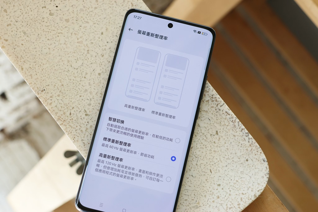 螢幕本身支援 120Hz 超高更新率,解析度則為 2412 x 1080 (FHD+),可以從設定裡調整螢幕更新率,推薦可以直接套用智慧切換,讓手機依照使用者當前的操作情況自己調整螢幕更新率。