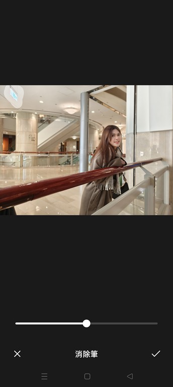 然後手機就會自動演算,補足畫面空缺的部分,看看對比一開始有逃生門告示的照片,使用消除筆後照片是不是看起來更乾淨了呢!