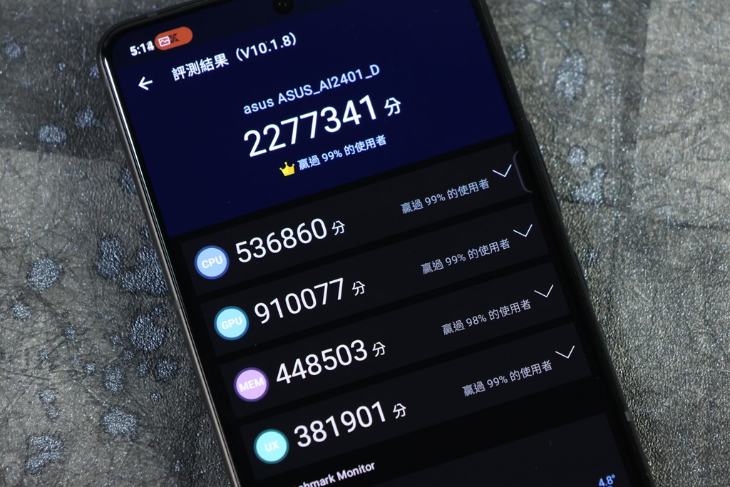 我們也透過多套跑分軟體來測試效能表現,官方提供實驗室安兔兔跑分達 235.99 萬分,在一般環境與設定下,我這邊實測達到 227.7 萬分的成績,比去年的機種效能又提升不少。