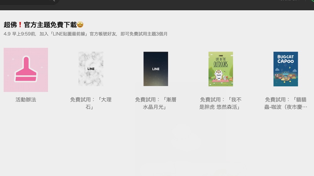 為了喜迎 2024,社群軟體 LINE 推出 4 款限時免費主題 – 「大理石」、「漸層水晶月光」、「我不是胖虎 悠然森活」、「貓貓蟲-咖波(夜市慶典篇)」,只要加入或解除封鎖「LINE貼圖最前線」官方帳號,就能夠免費使用 91 天!