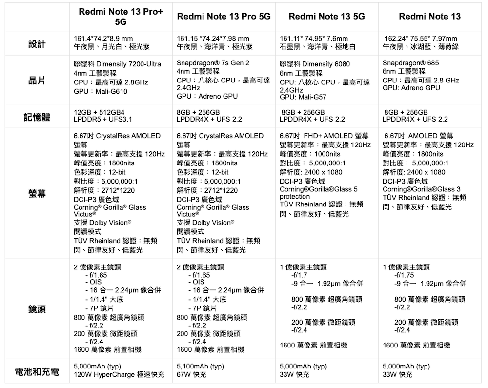 規格上 Redmi Note 13 Pro 使用高通 Snapdragon 7s Gen 2,僅提供 8+256GB 容量組合配置,電池容量是 5100mAh。Redmi Note 13 Pro+ 是使用聯發科天璣 7200 Ultra 處理器,提供 12+512GB 容量組合,電池容量是 5000mAh,但支援 120W 極速快充與 IP68 防塵防水。