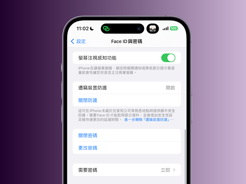 開啟「遭竊裝置防護」後,如果 iPhone 不在熟悉的位置,你必須先使用 Face ID 或 Touch ID 進行認證,才能執行某些動作,