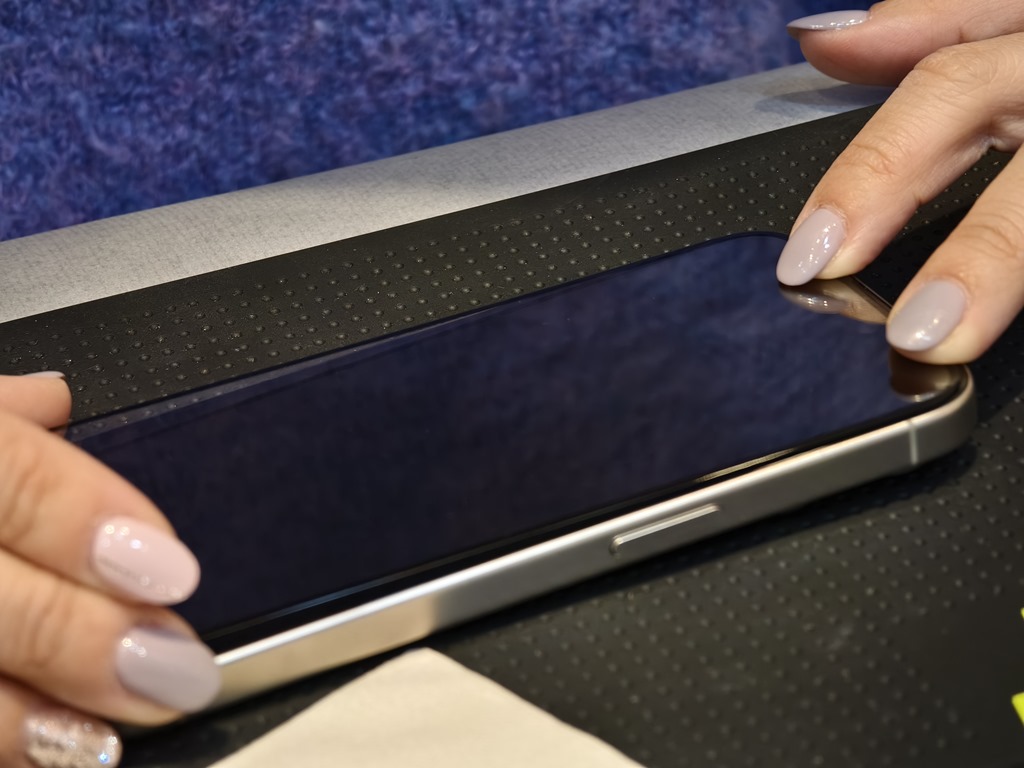 對了,因為 iPhone 15 系列是平面螢幕,黏貼上也非常容易,只要清潔手機表面後,將保護貼一邊對準輕輕放下後,他就會自動貼牢,非常簡單。如果貼歪了,直接掀起來再貼一次就好。不過要注意的是,黏貼保護貼時盡量再乾淨的室內,空調建議先關掉避免空氣中有細微揚塵,這樣成功率就會提高很多。