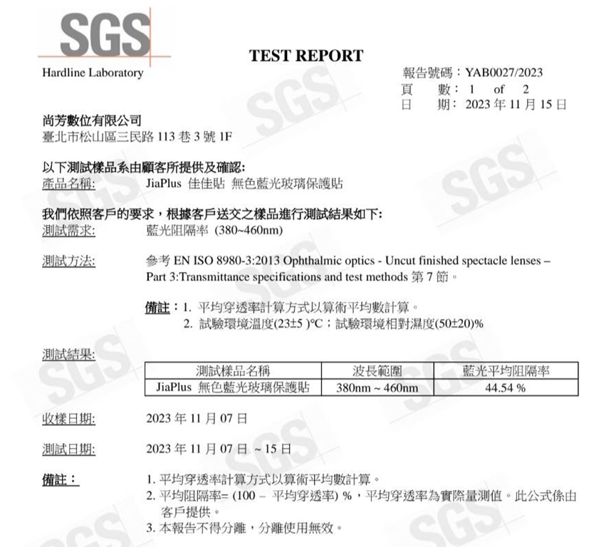 沒錯,雖然三款都是抗藍光保護貼,左邊那款偏黃、右邊根本就是戴上墨鏡了,而中間那款不只沒有色彩偏差,透光率也相當高。不過沒有顏色真的能抵擋藍光嗎?直接看台灣之名檢驗單位 SGS 的報告最準確,這款名為 JiaPlus 佳佳貼無色藍光玻璃保護貼,可有效阻隔 44.54% 380~460nm 波長的藍光,這就證明即使是無色透明,也能有效保護雙眼降低藍光傷害。