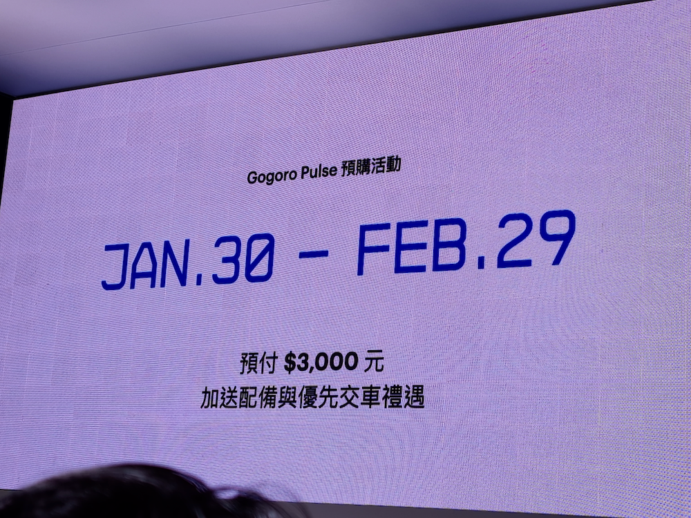即日起至 2/29,Gogoro Pulse 先鋒預購計畫限時展開,只要在官網完成線上支付 $3,000 元並於指定時間內完成購車程序,即可享有優先交車席次並加送配備等禮遇,成為首批擁有 Gogoro Pulse 的騎士。$3,000 元預付金於簽署正式購車契約時將轉為部分購車定金,Gogoro 將通知已預購的消費者,於指定時間內至 Gogoro 門市完成購車程序,即可優先配車。