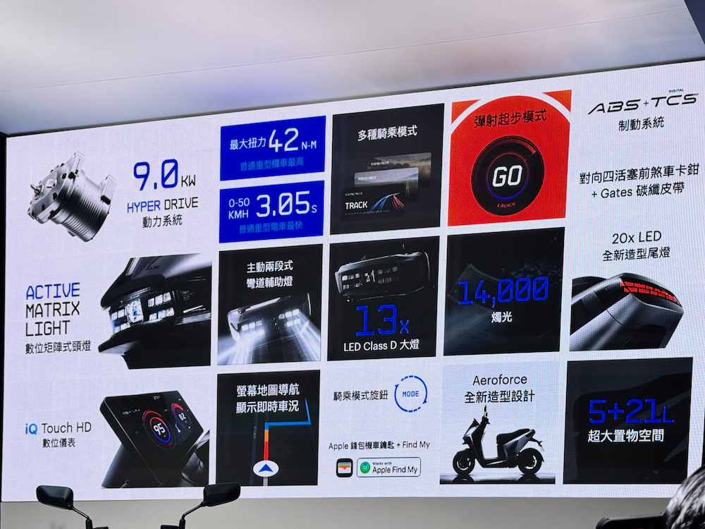 iQ Touch HD 數位儀表提供完整即時的車輛狀態數據,大幅提升騎乘便利、安全與樂趣。10.25 吋的全景高清觸控螢幕整合實時騎乘數據、地圖導航與即時路況、GoStation 電池交換站地圖,多種騎乘模式配合裝置於車輛龍頭選配的「騎乘模式旋鈕」,騎士可依據自身偏好在「續航 / 泥地 / 都會 / 長途 / 賽道 / 自訂」等六類騎乘場景與「彈射起步模式」中快速切換。