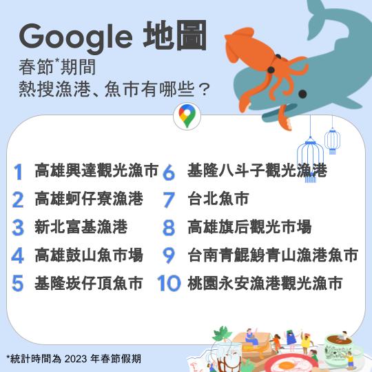 除了傳統市場,春節期間 Google 地圖上最熱門的台灣魚市熱點排行榜中,高雄、基隆兩大國際港口所在地,都有許多魚市入榜,高雄更是有高達 4 個魚市榮登前十名,包括冠、亞軍的興達港和蚵仔寮漁港。而在基隆,則有崁仔頂魚市、八斗子觀光漁港兩處上榜,顯示兩座港都漁業的重要性,以及影響台灣民眾飲食、出遊的海島文化。