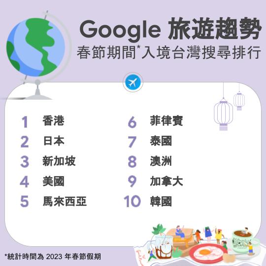 另外,透過 Google 的旅遊趨勢探索工具,也發現在 2023 年春節以台灣為目的地進行機票、飯店搜尋的海外遊客,除了最多來自鄰近的日本、香港、新加坡等地,來自美國、加拿大的旅客,也對春節期間造訪台灣有高度興趣。