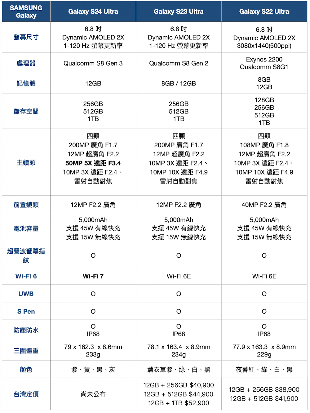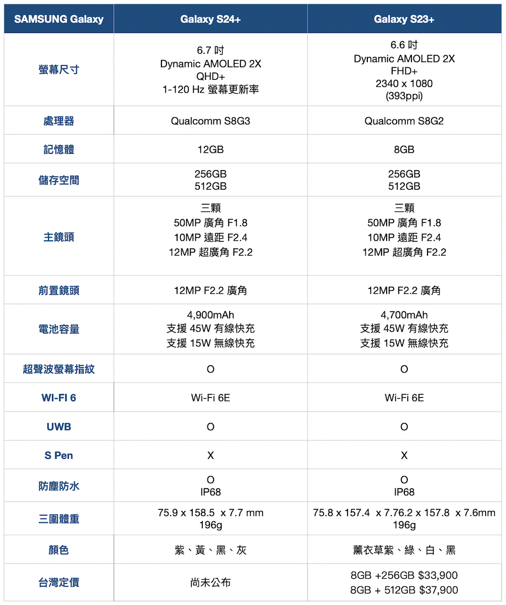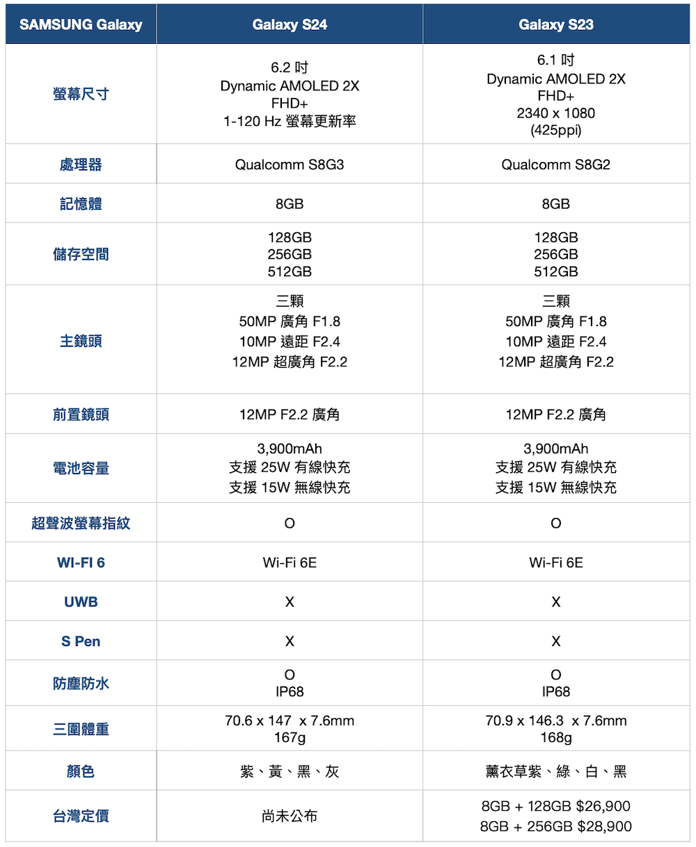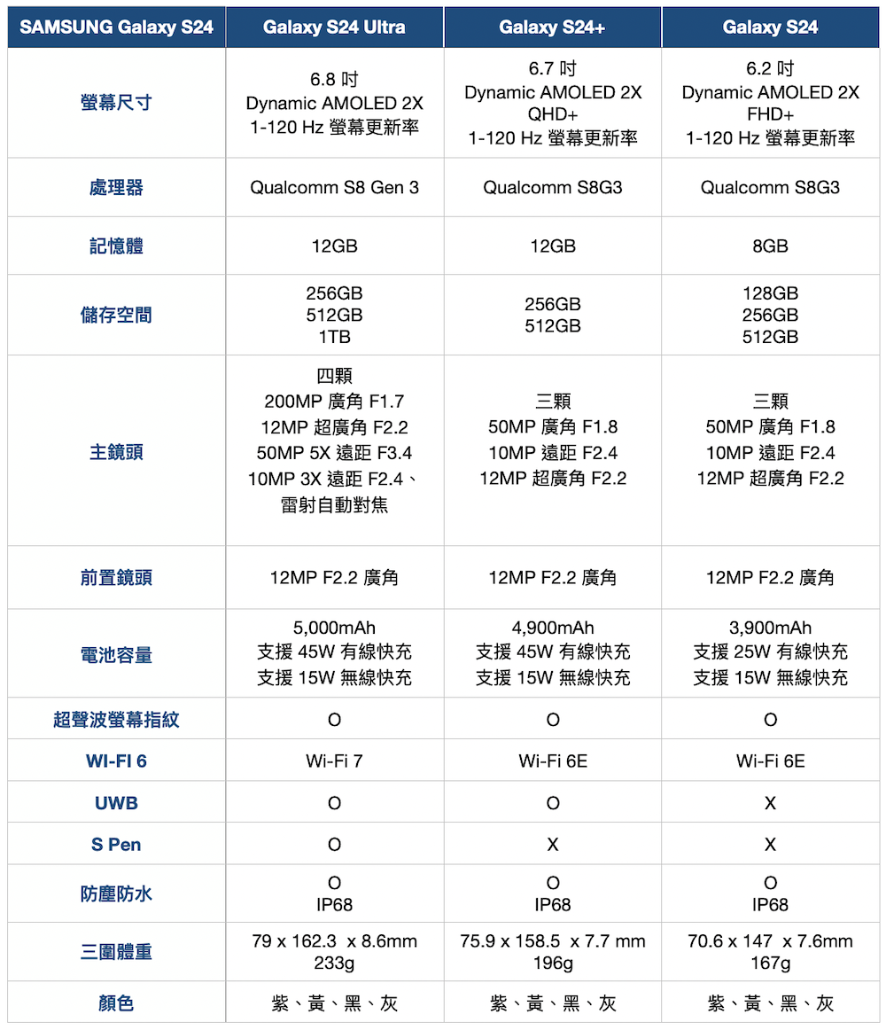電量方面三款分別為 Galaxy S24 4000mAh、Galaxy S24+ 4900mAh、Galaxy S24 Ultra 5000mAh,記憶體與容量組合這次也都相當單純,Galaxy S24 是 8GB RAM,Galaxy S24+、Galaxy S24 Ultra 都是 12GB RAM,容量 Galaxy S24、Galaxy S24+ 都只有 256GB 和 512GB 兩種選擇,Galaxy S24 Ultra 再多過一個 1TB 選項。