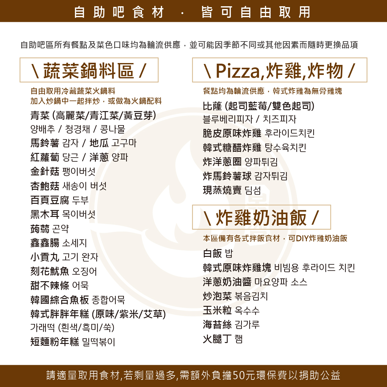 甩鍋雞自助吧食材有蔬菜鍋物區、炸物、炸雞、披薩、炸雞奶油飯等等,另外一邊有飲料、冰淇淋等等,通通都是無限供應吃到飽